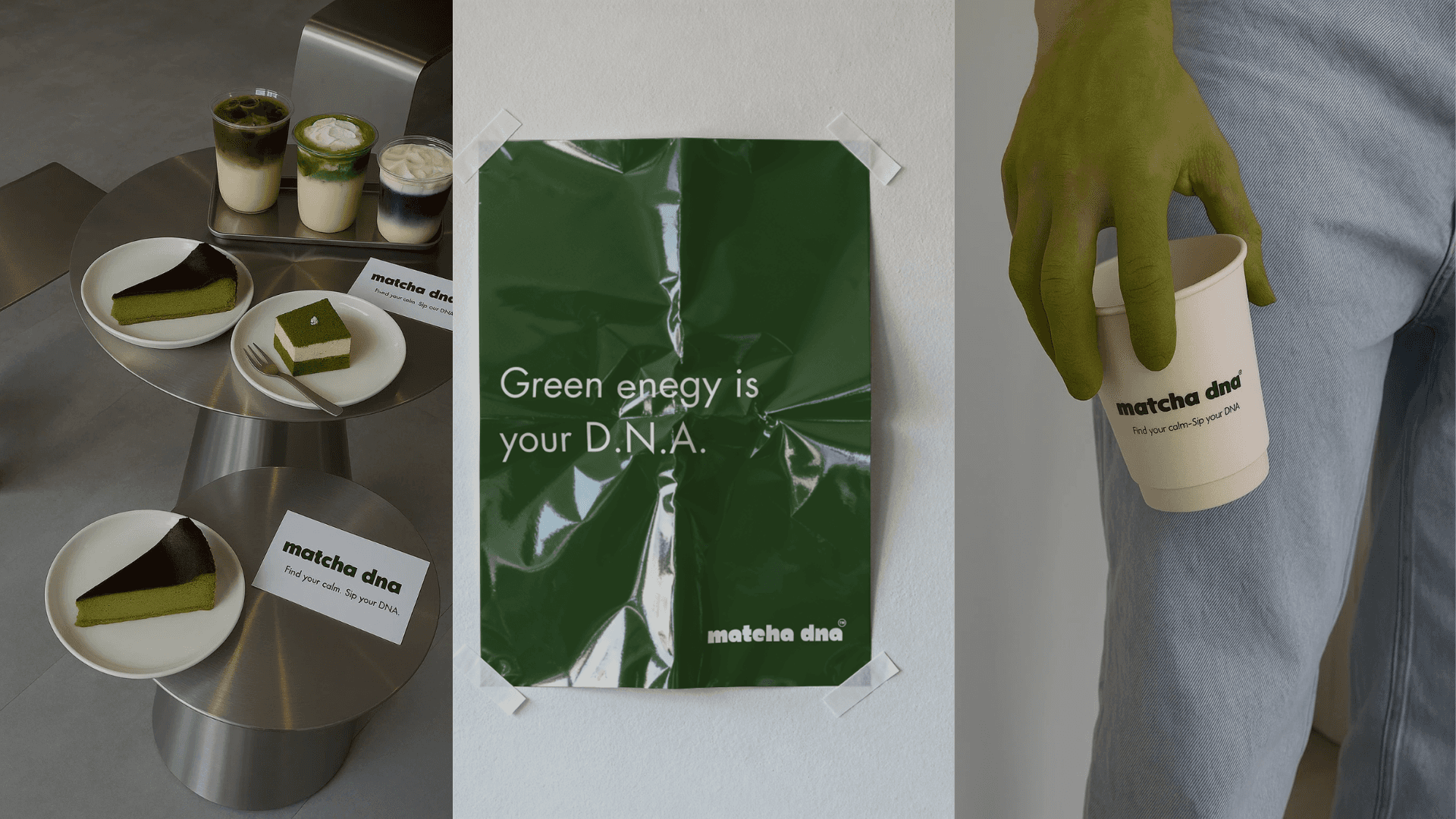 Matcha dna is a Seoul-based concept brand exploring a calm, modern identity for a matcha café/product line. The direction pairs deep green tones with soft typography and stainless-steel cues. Tagline: “Find your calm. Sip your DNA.